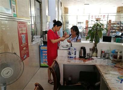 旅客(右一)在服務(wù)臺免費取用防暑降溫藥